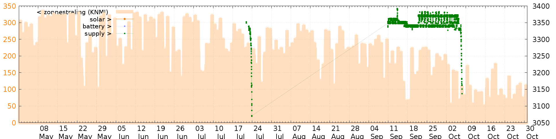 Battery and solar voltage measurements of the last 6 months: