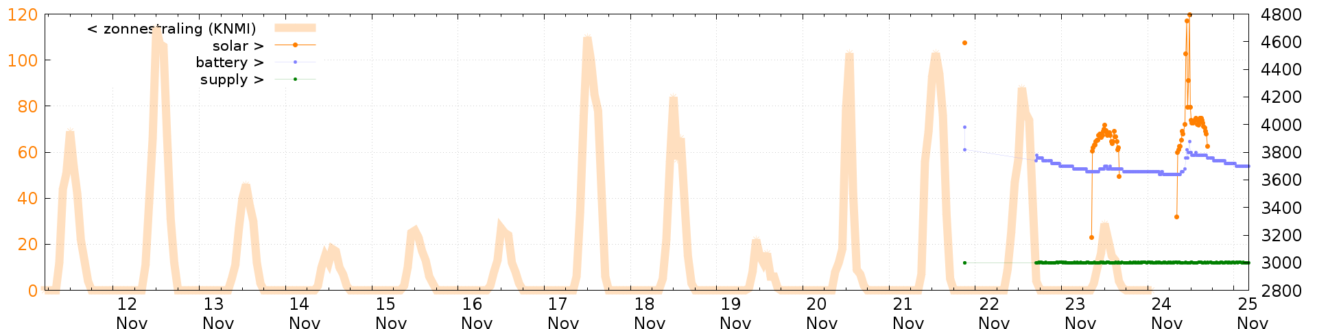 Battery and solar voltage measurements of the last 2 weeks: