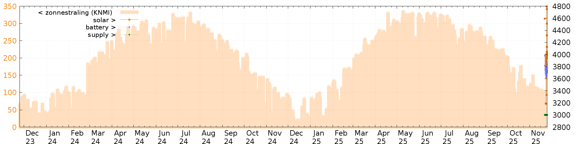Battery and solar voltage measurements of the last 6 months: