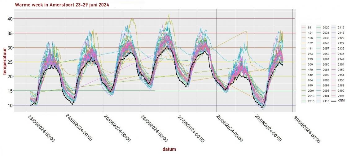 In de stad was het een stuk warmer dan bij het KNMI, de zwarte lijn met stippen. Het was bij één meetkastje zelfs boven de 40 graden terwijl het KNMI die dag net de 30 graden aantikte.